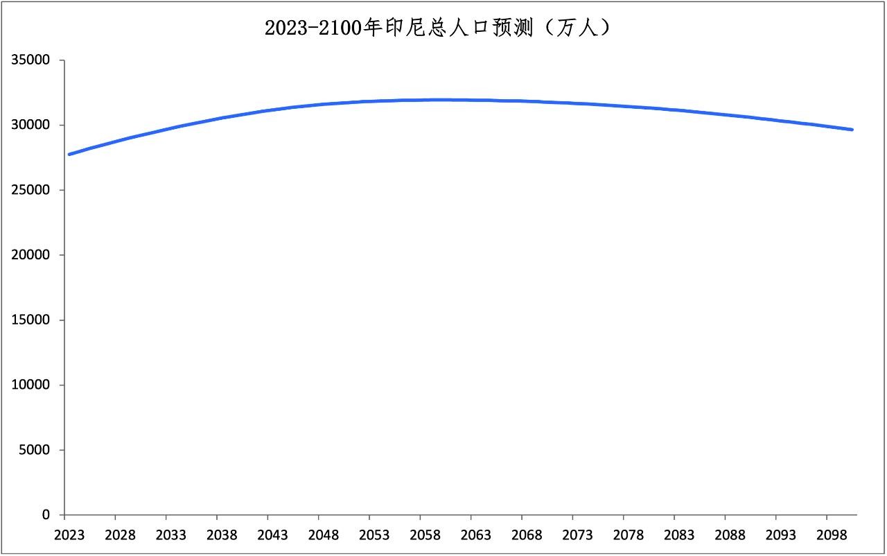 根据上述预测,印尼总人口从2023年的27753万增加到2059年的31942万,然后缓慢下降,到2100年下降至29662万。