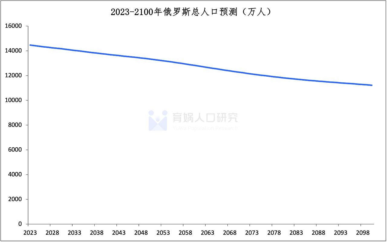 根据上述预测,从2023-2100年,俄罗斯总人口从14489万缓慢下降至11220万,占全球比例为1.1%。