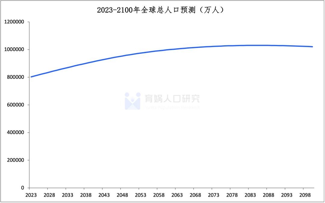 全球总人口在2022年11月15日达到80亿。全球总人口预测的计算方法是:在联合国中方案的全球总人口预测中,减去中国部分,然后加上育娲人口对中国总人口的预测数据,从而得到全球总人口预测数据。下图是2023-2100年的全球总人口预测: