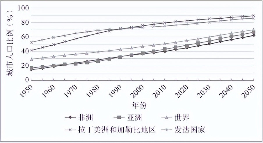 世界人口的另一个主要趋势是,随着经济的发展,越来越多的人生活在城市。2008年,有超过50%的人生活在城市中。这一数字在20世纪50年代时只有30%。预计到2050年,世界上将会有超过70%的人生活在城市中。在发达国家中,大约有90%的人将生活在城市里(见下图)。这是工业和服务业增长的直接结果,也是农业相对衰落的结果。