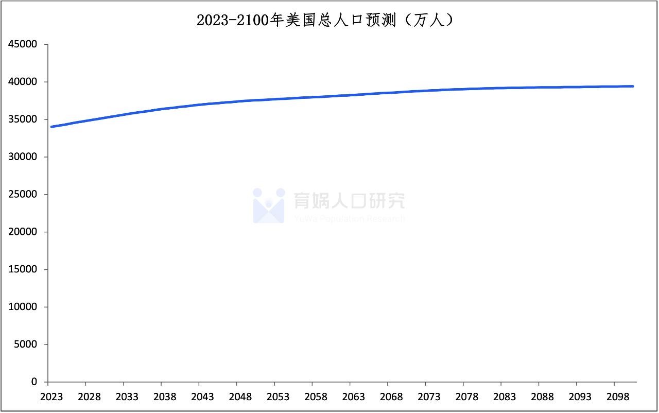 虽然美国生育率长期低于更替水平,但生育率仍高于发达国家平均水平,并且由于美国每年吸收大量外国移民,所以从2023年至2100年,美国总人口一直缓慢增长,到2030年,美国总人口为3.5亿;2050年,美国总人口3.8亿;2100年,美国总人口近4亿。
