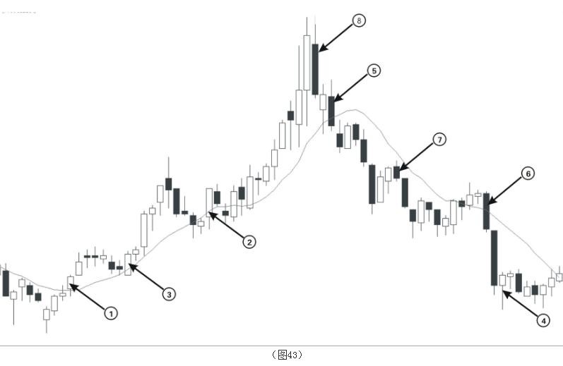 图示葛兰碧八大法则,以10日均线为例。见图43。