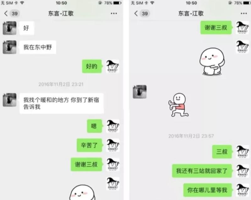 21点余 江歌下课(学校距租住处30余分钟交通路程距离,东中野站距离住处10分钟步行路程)发微信告知刘鑫自己下课了(未得回复)