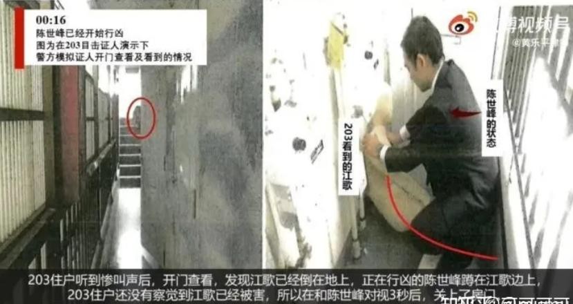 经警方查实(邻居口供)及法医报告显示,在江歌抵达二楼门口处挂伞开门时,陈世锋跟随,于身后直接用刀刺向脖颈(合计11处伤口,为6刀从右至左平行伤穿刺导致;手指上有5处轻微防御伤。全程仅有2个脚步声及一声类似猫的叫声,无争执打斗声)