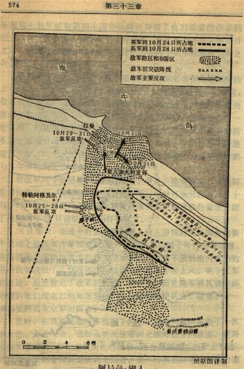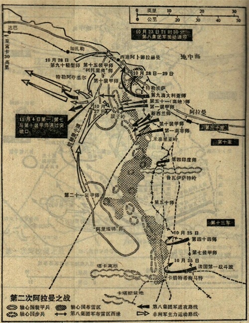 大计已定,那就开战吧!决定命运的时刻到来了!期盼已久的时刻到来了!23日的月明之夜,沙漠大地突然千炮齐鸣,震天动地,此乃英军开战以来首次聚集起如此规模的炮火,真可谓大手笔也。敌人被炸的晕头转向,心胆俱碎,损失惨重,其后方通信全毁,指挥能力瞬间降为零,英军也算是大快人心一回。在隆隆炮声中,中东总司令亚历山大向身在伦敦的丘吉尔发来了“齐普”的电报信号,这是他们事先约定的:一当开战,亚历山大就要向丘吉尔发来报喜的信号。对丘吉尔来说,这是一个兴奋高涨的时刻,这是一场久旱逢甘霖的战役,为了这一天,他在痛苦、紧张、不安中等待了多少个日夜。“齐普”信号一来,他立刻把这个喜讯转发给罗斯福总统,他要与总统分享这一激动人心时刻。