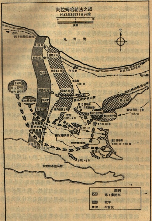 8月31日子夜时分,隆美尔开始了他的新攻势,整个攻势连同它的撤退只持续了六天。第一天一进攻就很不顺手,遭遇英军异乎寻常的抵抗,进攻失去了突然性,隆美尔的信心开始动摇。终于突破了英军防线,但不敢再深入英军纵深,隆美尔决定提前向北迂回(原计划深入英军纵深30英里才北转),而后又遭遇英军44师依托阿拉姆哈勒法山脊的坚固防御。但让隆美尔更闹心的是,英军航空兵的持续轰炸伴随他攻势始终,炸得隆美尔是人仰马翻,损失严重,别说进攻了,守在原地都困难。另外,英军炮兵也很凶猛,毫不吝啬地把大把大把的炮弹砸到了隆美尔军队的头上。第三个让隆美尔闹心的事当属燃料严重不足,意军统帅部原打算要运来5000吨燃料,这是隆美尔敢于发动这次攻势的一大底气,结果一部分被炸入了海底,一部分还未运出,这样隆美尔的底气也就彻底丧失了。9月3日,他不得不灰溜溜地撤退了。遵照蒙哥马利的计划,英军没有进行猛烈的追击,这场阿拉姆哈勒法之战就此结束。敌对双方从这场战役中得到了相同的结论:战争要易势了,屡战屡败的一方现在可以转入决定性进攻了,屡战屡胜的一方现在不得不转入守势了。