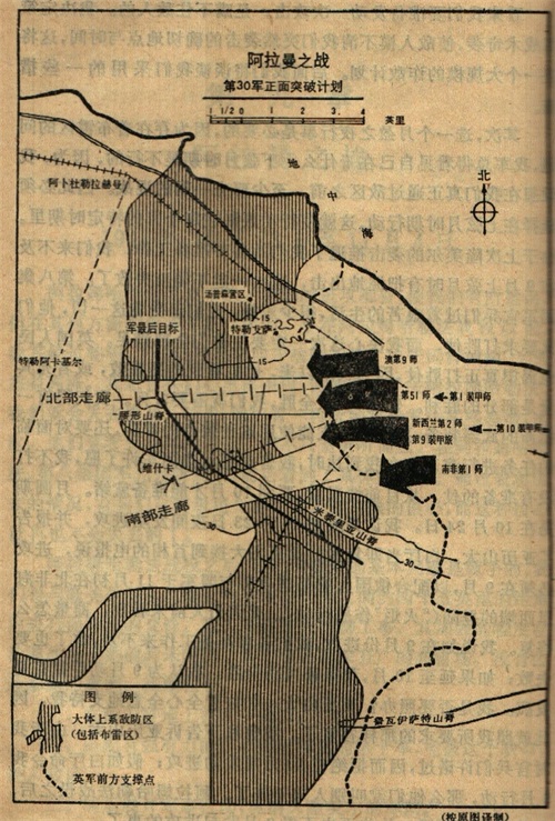 具体的作战计划是,30军在北面(中央偏右方向)担任主攻,突破北面德意军防线,在包括雷区在内的敌人防线上打开两条通路,一条(北部走廊)通往腰子岭,一条(南部走廊)越过米泰里亚岭。之后,10军的装甲师通过通路,越过30军部队,进入战线另一边的开阔地,占据阵地,迎战敌装甲部队的反击,而步兵自然是要展开对敌一线固守步兵的“粉碎性”打击。13军则部署于南面,展开助攻,牵制当面之敌。另外,为了保障主要进攻计划,蒙哥马利还制定了专门的诈敌计划和保密计划,花大力气并投入不少资源,迷惑敌人,隐藏自己的进攻企图。