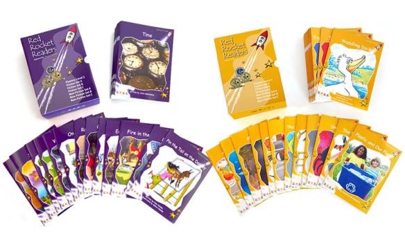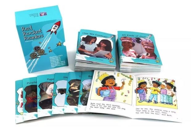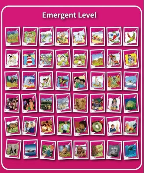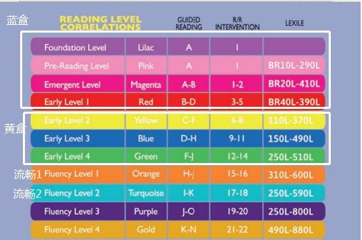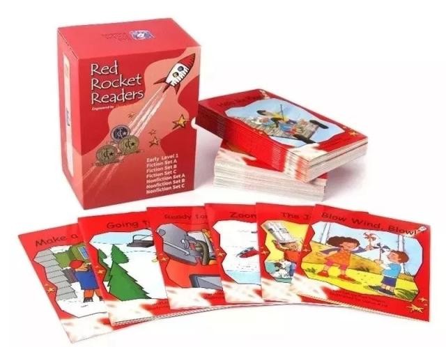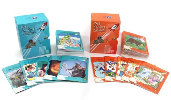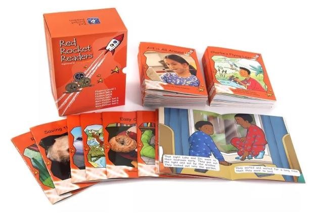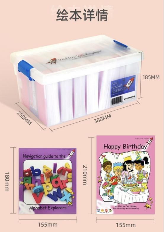 红火箭蓝盒套装包含了Foundation Level——Alphabet Explorer(丁香紫)、Pre-Reading Level(粉色)、Emergent Level(洋红)、Early Level 1(红色)4个级别,共174本读物和1本指导手册。