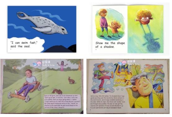 这一阶的句式比Early Level 1稍长一点,一幅图搭配的句子大概有三句,涉及到的基础单词更多,主题更广泛,故事类读物的情节开始渐渐饱满起来,也更有趣味了,Sula在读这一阶时,经常会读的哈哈大笑。