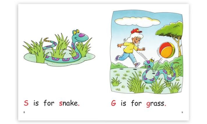 在攻读完字母书之后,下一阶的粉色预备级中,会再次重复这些字母在哪些单词中会出现。