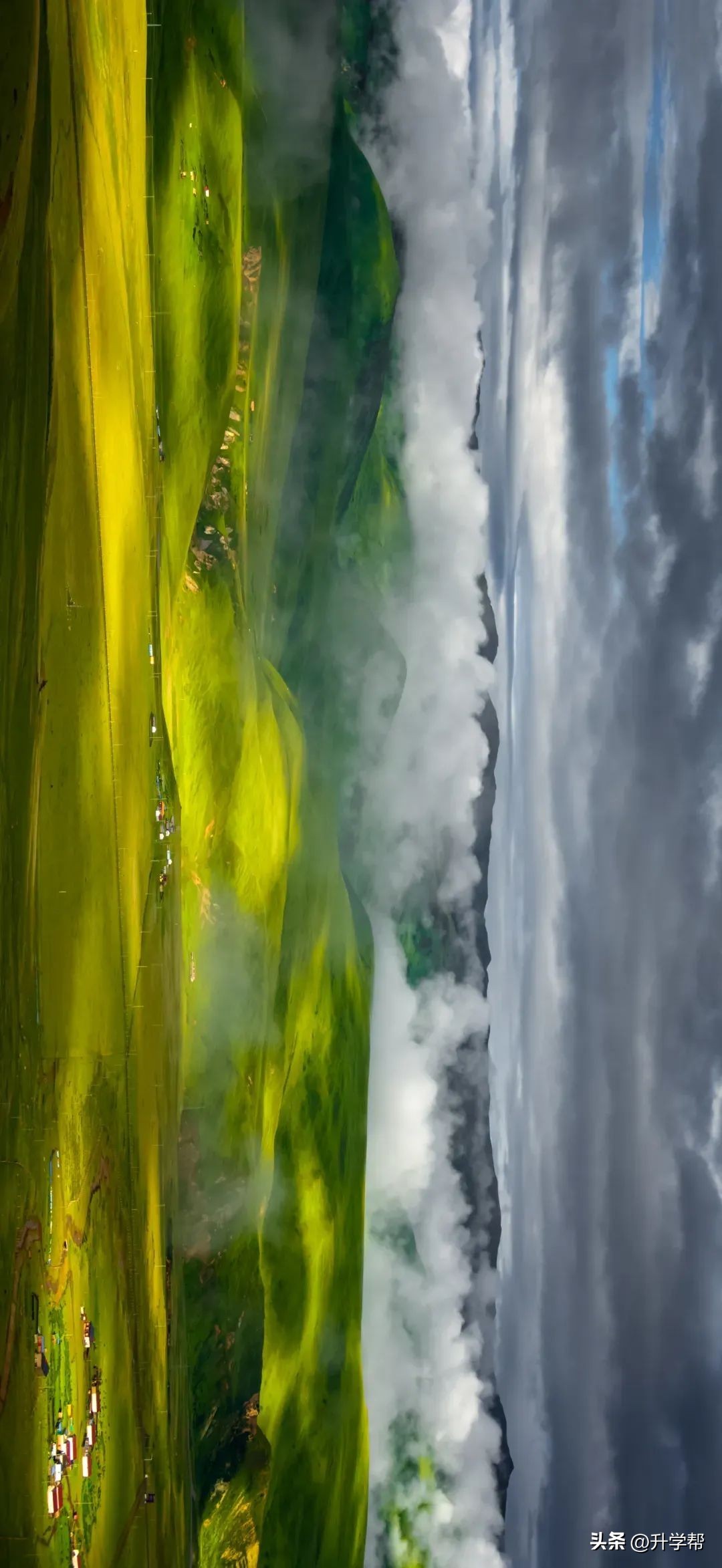 草原长约八公里,宽不到两公里。群山环绕下,牛羊、帐篷、炊烟、鲜花,宛如一幅五彩的画卷。
