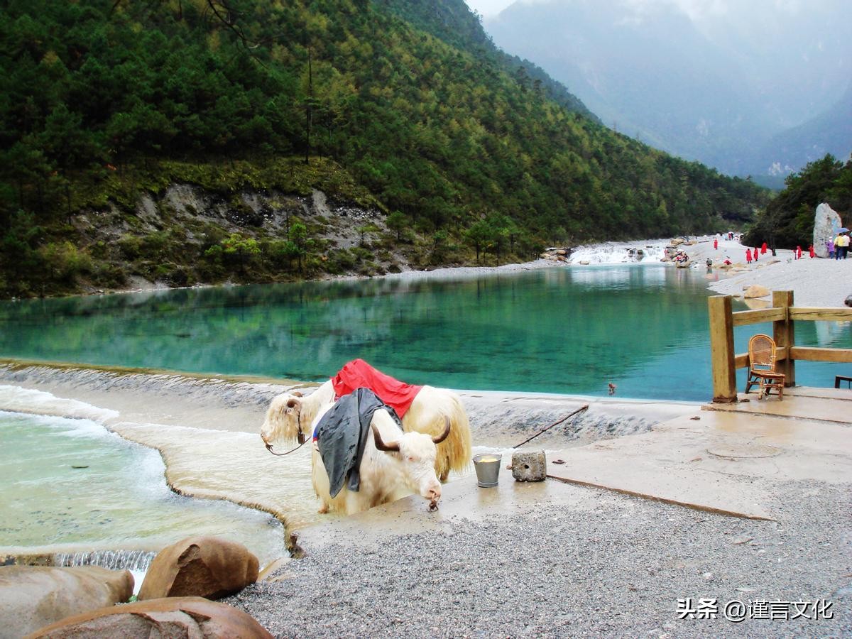 蓝月谷景色美丽,周围群山环抱,绿树成荫。湖水与周围的自然景观相互映衬,构成了一幅美丽的画卷。这里是游客们欣赏自然风光的好去处,也是摄影爱好者的天堂。