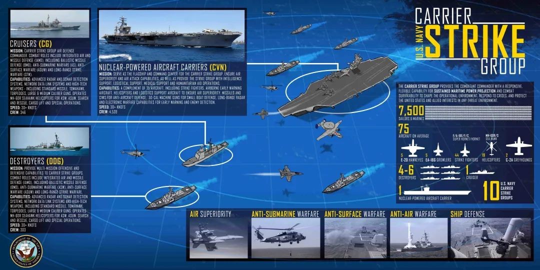 美国航空母舰打击群(CSG)配置,根据作战任务不同会有差别,一般包括1艘航母、2艘导弹巡洋舰、2-4艘导弹驱逐舰、2艘攻击型核潜艇和1艘补给船。