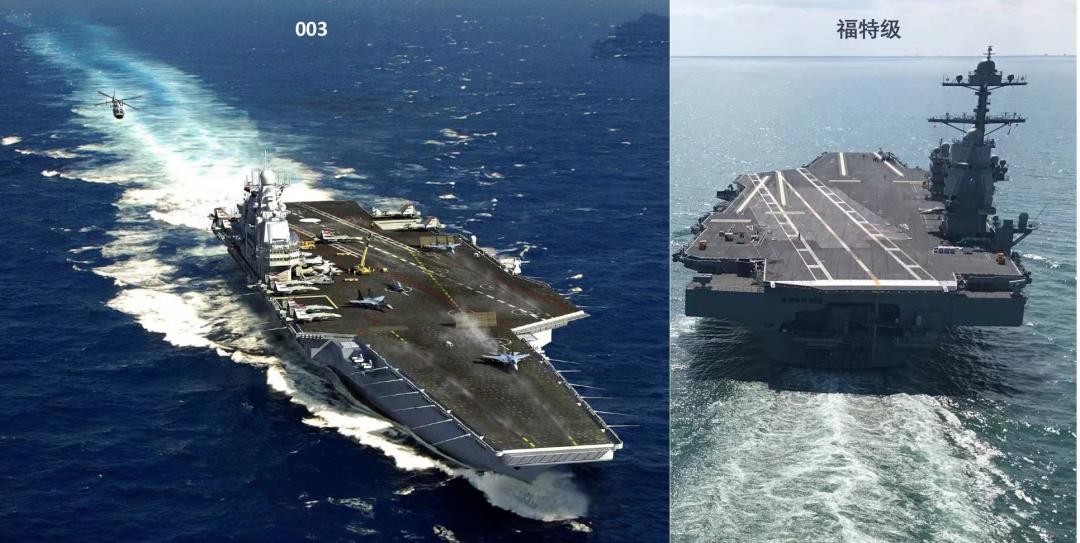 整体尺寸明显比山东舰大一号,相比美国最新超级航母福特级(10万吨),003长度略短一些,但要比福特级(76米)更宽。