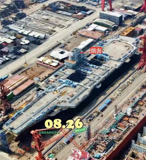 003航母在建造阶段流出的照片显示,舰岛带有烟囱,这是常规动力航母的标志。