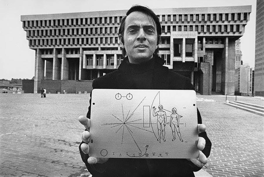 卡尔萨根在波士顿市政厅门口举着先驱者10号的金属牌