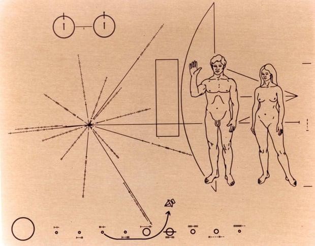 至于牌子上的内容呢,是卡尔萨根和德雷克两个人设计的。这二位可是大名鼎鼎啊,德雷克是专门研究无线电天文学的,他主持了搜寻外星人的无线电信号,还主持了阿雷西博天文台的扩建。这位也是个强烈的外星人爱好者。牌子上那两个裸体小人呢,那是卡尔萨根的妻子画的。卡尔萨根的第二任妻子刚好是个艺术家。