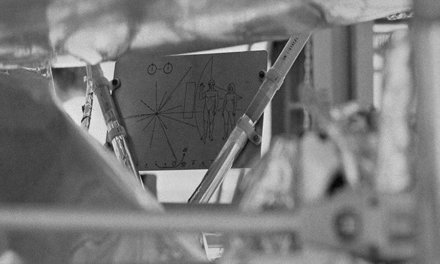 牌子右边画了一对裸体的男女,表达人类的问候,人身边的弧线是先驱者10号探测器的轮廓。和人体身高的比例完全符合实际。