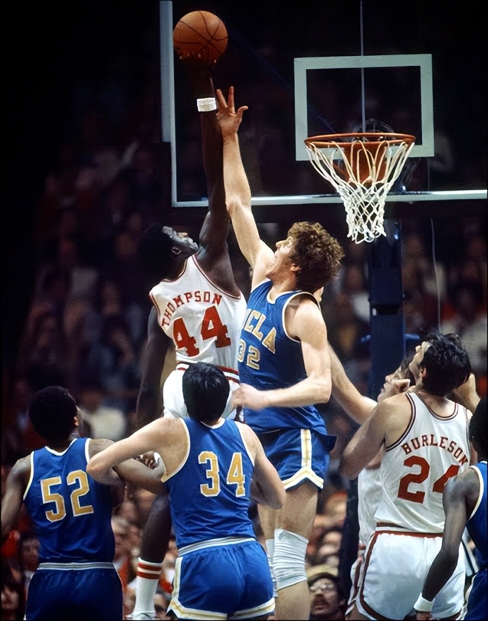 1974年,汤普森在大学生涯的高光时刻中,以出色的表现带领北卡罗莱纳州立大学击败了由传奇中锋比尔·沃顿带领的UCLA,晋级到了NCAA锦标赛半决赛。