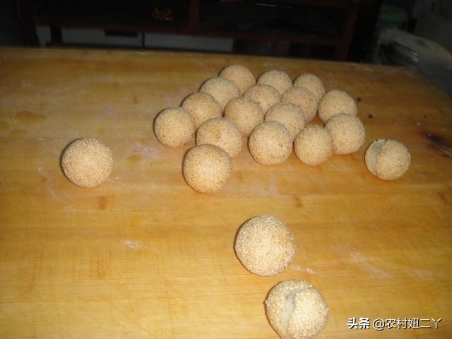 沾上一层麻仁,将油烧至60--70度时即可下锅炸,浮起表面呈枣红色即可出锅。