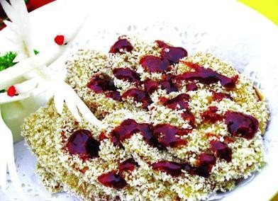 原料:熟大肠头(造型似九转大肠)500克,面包糠50克。调料:李锦记海鲜酱220克,日本烧汁50克,冰糖水20克,沙拉酱50克,色拉油1千克,韩国烧汁(芝麻香味)10克,鸡蛋夜50克,生粉80克。制作:1、李锦记海鲜酱、日本烧汁、冰糖水、沙拉酱、韩国烧汁调匀制成多味汁。2、大肠头片成大斜片,拍生粉后裹匀蛋液,拍上面包糠,入烧至五成热的色拉油中小火浸炸2分钟至色泽金黄,取出装入盘中,表面淋10克调好的多味汁点缀,其他多味汁装入小碗中跟大肠一起上桌。特点:质地酥脆,味道鲜美。备注:熟大肠头的制作:大肠头洗净,按九转大肠的做法套好,两头用牙签别住,入卤水(做法参照往期杂志中介绍的卤水配方)大火卤40分钟。创意:撇开别的不说光看味汁就绝对有新意,这款用沙拉酱、日本烧汁、海鲜酱、韩国烧汁、冰糖水调好的味汁,咸、鲜、甜还带有点儿轻微辣,配以炸酥的大肠,不仅味道别致,而且绝对不会让人感到大肠的油腻。