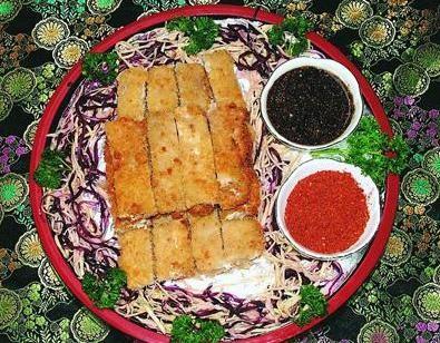 原料:草鱼扇骨片4块重约250克。调料:食盐50克,味精20克,料酒10克,胡椒粉3克,葱姜汁20克,鸡蛋2个,生粉75克,面包糠500克(耗150克),拌好的糖醋莲白丝100克,干辣椒面一碟,糖醋麻味碟(用糖醋熬稠后起锅时撒上花椒粉)。制作:1、取鱼的两扇翅骨肉,用刀将翅骨斩断后,加葱姜汁、食盐、味精、胡椒粉、料酒码味约5分钟,将鸡蛋、生粉调成全蛋糊,把鱼排拖匀全蛋糊后均匀裹上面包糠即成鱼排生辔坯。2、锅置火上,放油烧至四成热,将鱼排生坯逐一入锅小火炸至外酥内嫩、色泽金黄后出锅,改刀成条状装盘随味碟上桌即成。特点:鱼排外酥内嫩,味型奇特。制作关键:1、因主料选用鱼的边角料成菜,故翅骨多,须用刀尖斩排翅骨。2、全蛋糊调制不宜过干,炸制时油温偏高,否则遇糖易糊,影响其成菜色泽美观。味型:糖醋味,辣味,糖醋带麻味