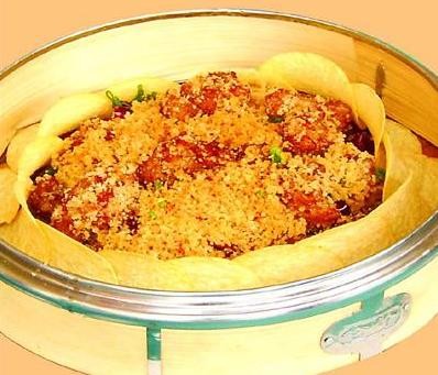 料:色拉油1千克,盐、味精各5克,白糖6克,吉士粉10克,生粉20克,料酒10克,嫩肉粉2克,葱花10克,蒜蓉水5克。制作:1、 锅上火放油烧至五成热,下面包糠小火炸至金黄色时控油。2、 猪肋骨切成2厘米长的段,用冷水冲去血水控干水分,放入料酒、嫩肉粉、盐、味精、吉士粉、生粉、蒜蓉水裹均匀。3、 净锅放油烧至六成热时下入腌好的排骨,小火炸约3分钟至色泽金黄时起锅控油。4、 净锅上火下入炸好的面包糠,放入糖炒匀下炸好的排骨小火炒香后,撒葱花,放入摆好署片的竹笼即可。成菜特点:色泽金黄, 排骨酥香。