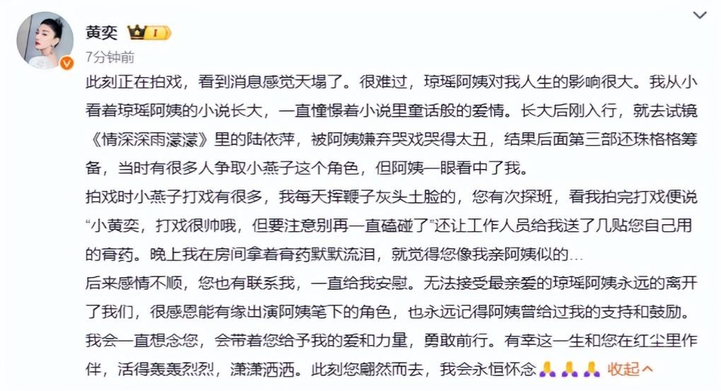 演员黄奕也在微博发文表示,自己正在拍戏,听到消息天都要塌了,黄奕表示,琼瑶对于自己的人生有很大的影响,是自己的伯乐。