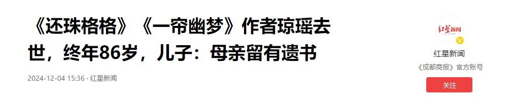 信息来源:《还珠格格》《一帘幽梦》作者琼瑶去世,终年86岁,儿子:母亲留有遗书