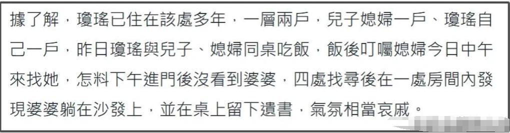 儿媳回到家中没有看到琼瑶的身影,进入房间才发现,琼瑶已经自杀身亡!儿媳很快的拨打了急救电话,但发现的太晚了,琼瑶已经彻底没有了生命体征。