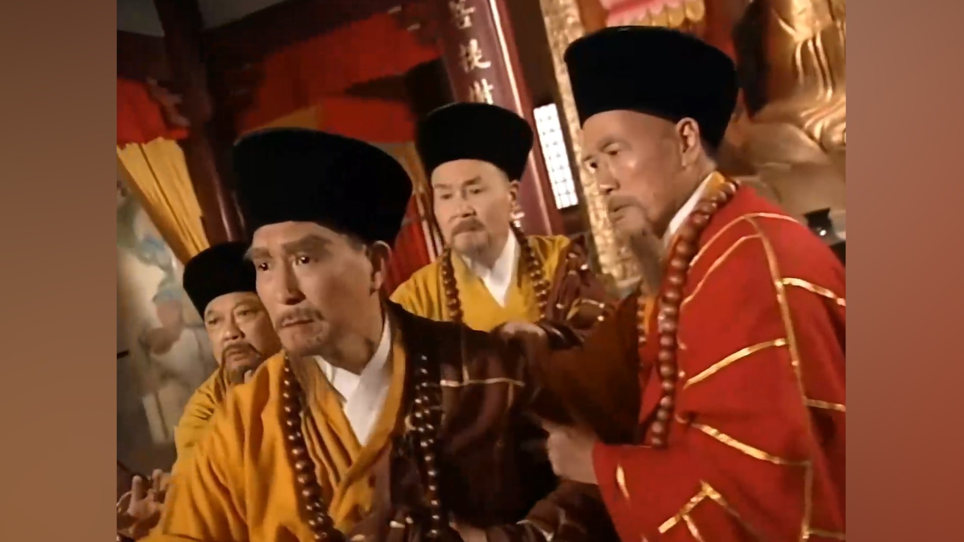 除了反派角色李海生有时也能扮演正面人物,《少林三十六房》中的戒律院主持就是其中的一个代表。片中他与刘家辉有过三场切磋较量,其中一场柳叶戒刀对阵木棍的打斗堪称经典。后来李海生也出演过不少的僧人形象,像是《三闯少林》中戒律院大师