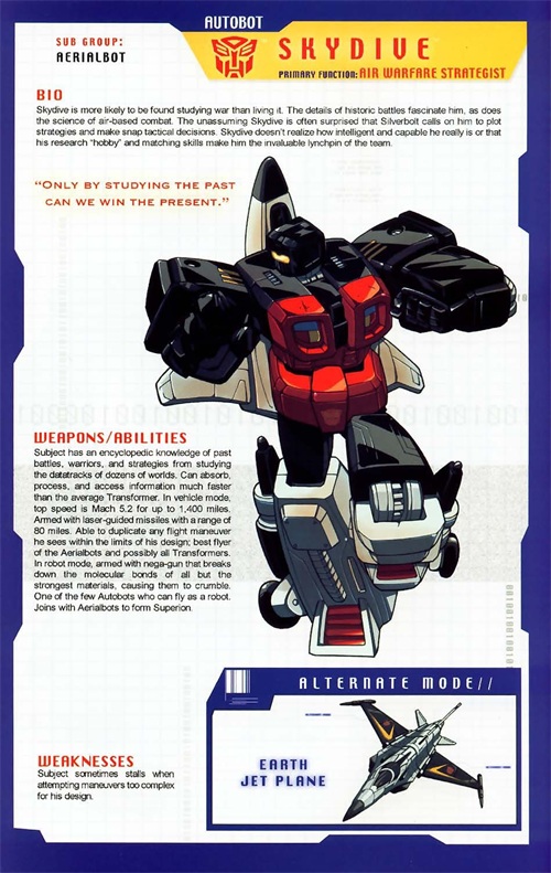 终于来了个相对靠谱的家伙,俯冲对于空战科学非常有兴趣,了解军事史上所有的战例,也是所有变形金刚中数得着的飞行家之一。他可以模仿眼中任何东西的飞行方式,只要在他的设计极限范围内。因此,和他做空战格斗会异常艰辛,霸天虎们常常被来自匪夷所思角度的攻击击落,这无疑是俯冲的杰作。变形为F16A战隼战斗机,空速可达2.6马赫,持续飞行2300KM,携带激光制导导弹,使用负能枪能通过破坏分子键来粉碎物体。俯冲行事比较谦虚谨慎,有时甚至谨慎地缺乏自信,他没有意识到自己在这个团队中的价值和重要性。有他在,银剑能轻松一些。