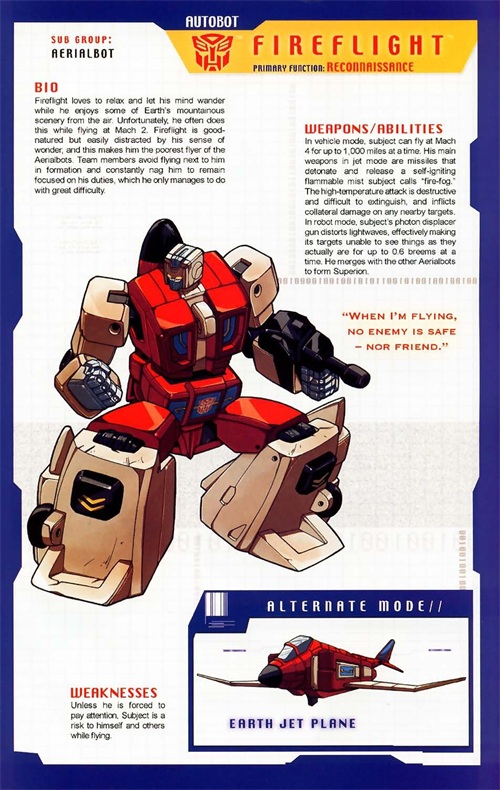 “飞行太保中最危险的家伙”这是敌人也是队友对飞火的称呼。如果天上有交警的话,飞火绝对会被终身禁驾,他太由着自己的性子飞行,从来无法预料他的飞行航线,这虽然让敌人无法捉摸,但也经常让同伴无所适从,想要配合他吧,扑空还是小事,更怕和他撞个满怀。他却还有闲情逸致看着风景。飞火变形为F4E鬼怪II型战斗机,飞行速度2马赫,可以持续飞行1600KM。配备易燃的火雾导弹。使用光子位移枪,能通过扭曲光波来产生视错觉。飞火喜欢冥想的的特点让人无奈,可是对他只能睁一眼闭一眼。