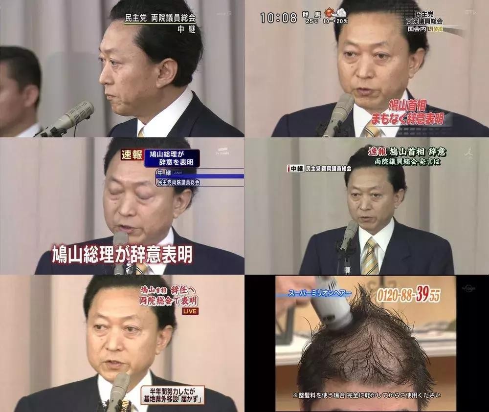 首相发表辞职声明,它在播放治疗秃头的电视广告。