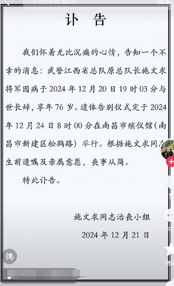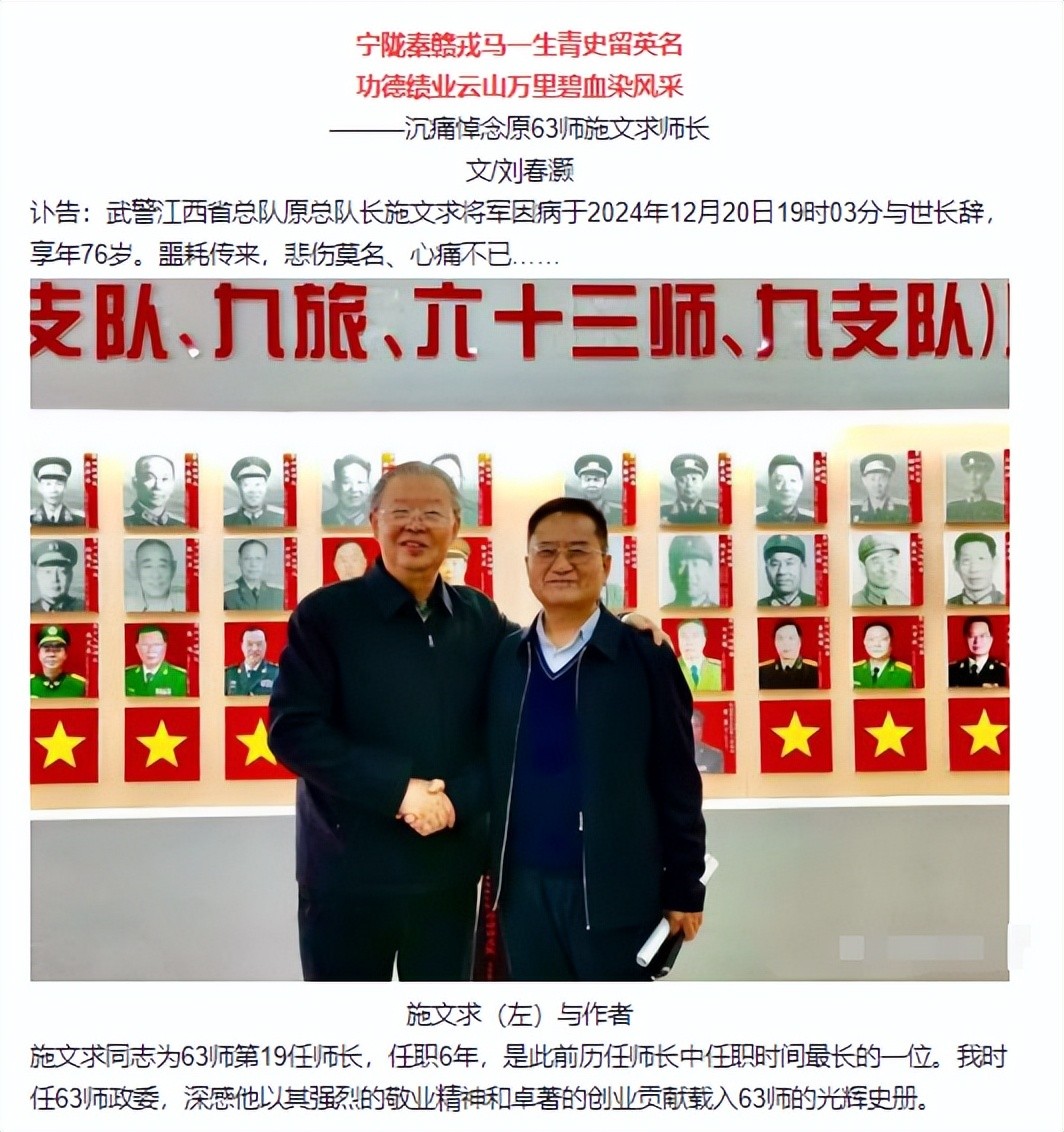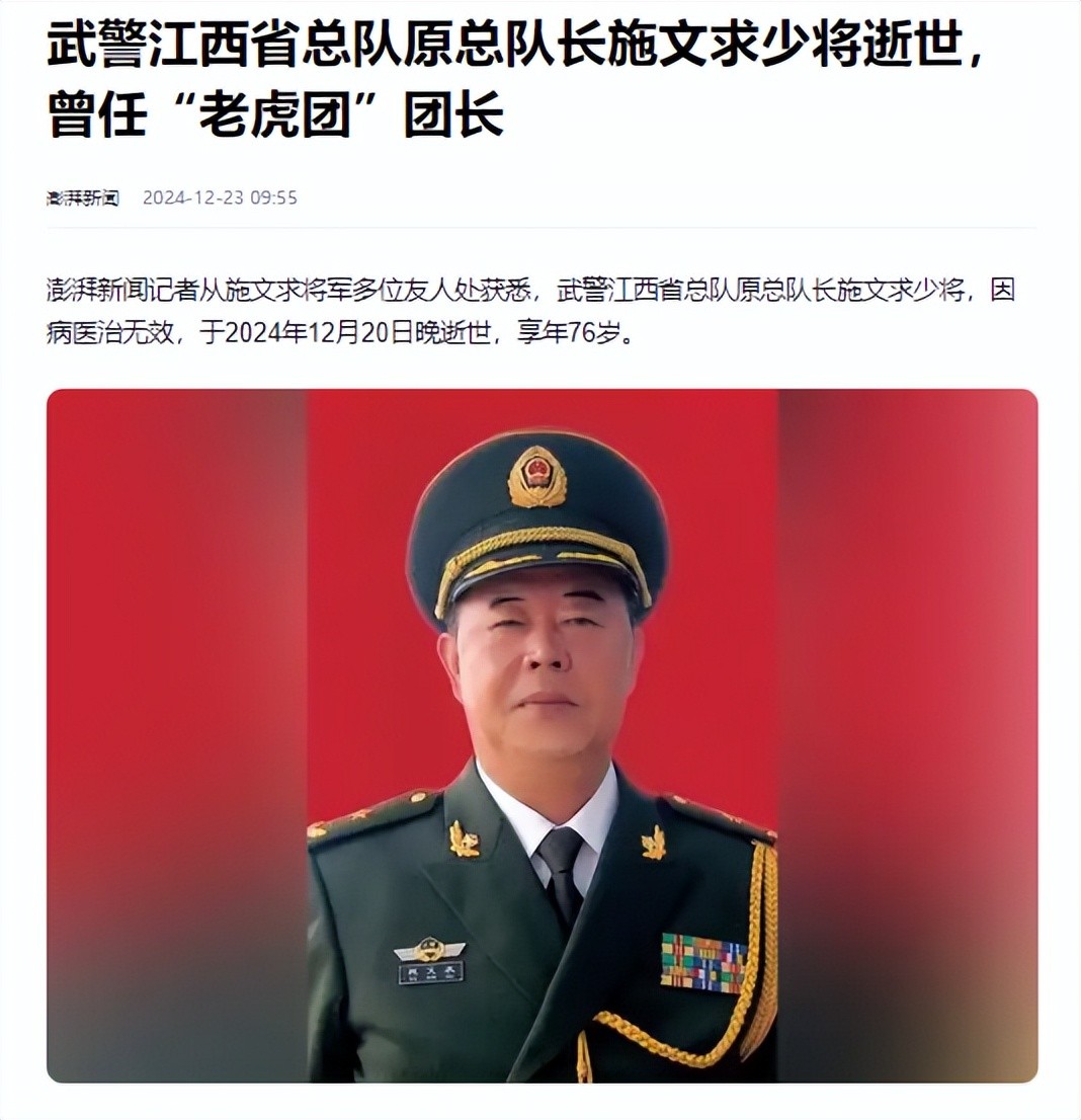 以上信息来源于——武警江西省总队原总队长施文求少将逝世8曾任“老虎团”团长 澎湃新闻2024 .12-23