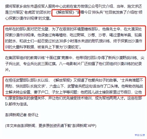 施将军故乡启东的退役军人服务中心的官方账号上曾表示:施将军曾担任过兰州军队的“老虎团”团长,身为一团之长,施将军发表了关于沙漠中作训的有关文章。