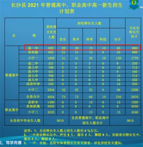 长沙县第一中学、长沙县实验中学纯文化生录取人数的65%到校指标学生分到各公办初中学校。按各校指标分配数,依据中招录取规则录取。