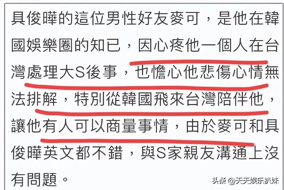 不过,具俊晔也不是坐以待毙的主儿,他迅速“摇人”,在韩国的多年老友听闻消息后,火速赶到台湾来安慰他。据说这位好友心疼具俊晔一个人在台湾处理大S的后事,忙得焦头烂额,半个月的时间就瘦了6公斤。而且,这位好友英语流利,和S家沟通起来没有障碍,这无疑给具俊晔增添了几分底气。有意思的是,台媒对具俊晔似乎还留了几分情面,报道时并没有过于苛刻。