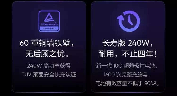 续航方面:150W版本的电池为5000mAh,240W版本的电池为4600mAh,配合秒充技术,几乎不存在续航焦虑。