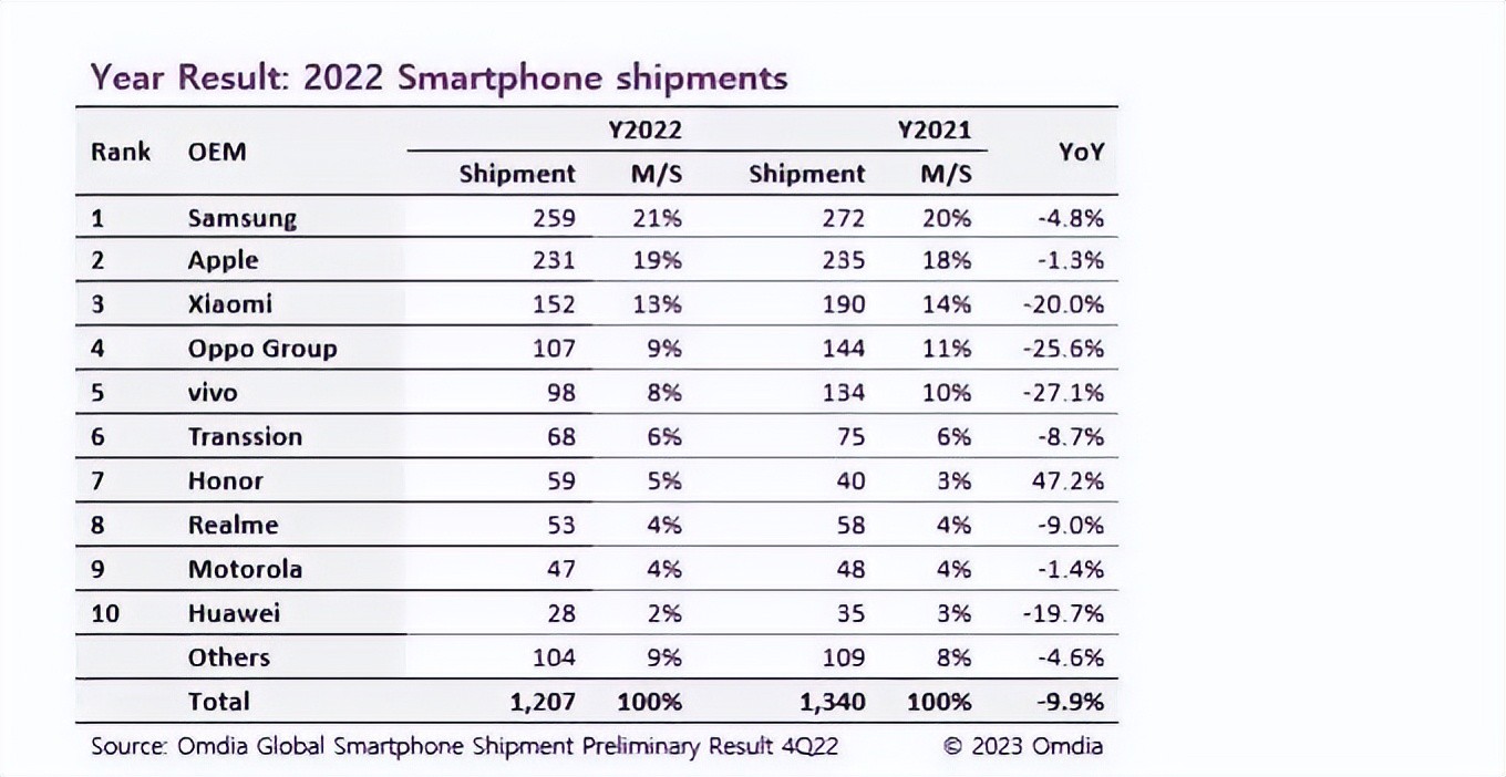 我们再从2022年全球手机销量排行来看,情况又不一样了,根据Omdia提供的数据显示,2022年销量排名前十的手机品牌分别是: