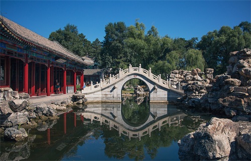 承德市区北部,为清朝皇帝消夏避暑和进行各种政治活动的地方,是中国现存规模最大的皇家园林。建于清废熙四十二年(1703年),乾隆五十七年竣工(1792年),历时89年。占地544万平方米。宫墙长达9322米。园内分宫殿区、湖区、山区,内有各种风格的园林建筑126处。康熙、乾隆将山庄内景点点名72处。兼有北方雄奇和南方秀丽园林艺术之精华。