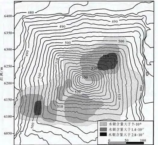 从这张图中可以清楚地看出,秦始皇陵封土堆大部分地方的水银含量超过了7×10-8,这表明秦始皇陵的封土堆下埋藏着大量的水银。