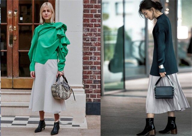 “灰色”裙子与绿色上衣搭配起来,就会得到适合城市的时尚搭配,凯丽绿色与灰色、墨绿色与灰色搭配,都能得到理想的配色。将鞋子用黑色搭配,包包也可以选择动物花纹的灰,也可以是黑色,都将赋予它们别致的光环。
