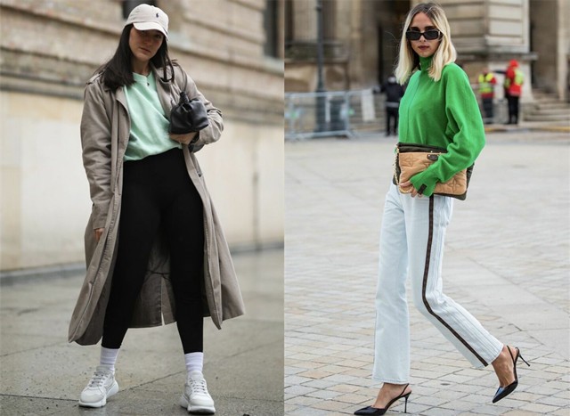 左图:薄荷绿色的圆领卫衣,与黑色紧身裤、白色运动鞋和米色帽子相结合搭配,一件漂亮的米色外套来提升休闲风格。白色运动鞋的协调性和淡绿色的上衣,增加了轻盈感。