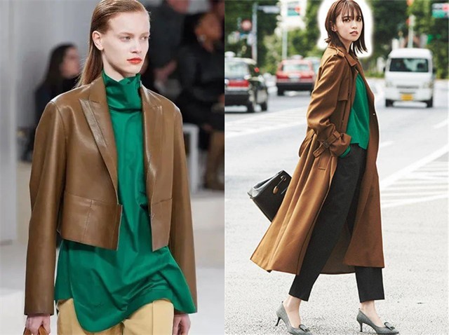 绿色与浅棕色或驼色搭配,沉稳的颜色组合在一起,可以将它们很好地组合成一组稳固的基地色,轻轻附和协调,并赋予一种锋利度,使其成为既时髦又带着柔和的亲和力。