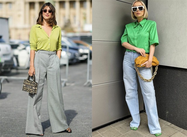左图:清爽的青柠绿衬衣,与格子阔腿裤构成漂亮的协调搭配,再搭配一个豹纹的迷你包,添上这样一勺“香料”,就会给人一种时髦摩登的感觉。