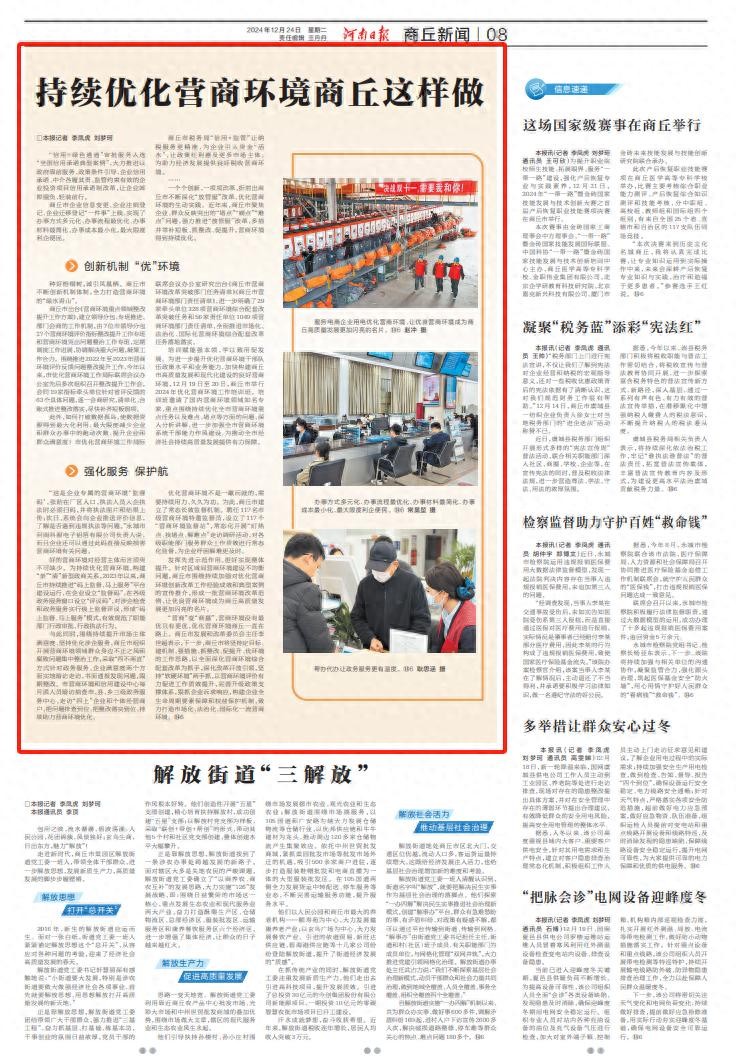 一个个创新、一项项改革,折射出商丘市不断深化“放管服”改革、优化营商环境的生动实践。近年来,商丘市聚焦企业、群众反映突出的“堵点”“痛点”“难点”问题,强力推进“放管服”改革,多措并举补短板、抓整改、促提升,营商环境得到持续优化。