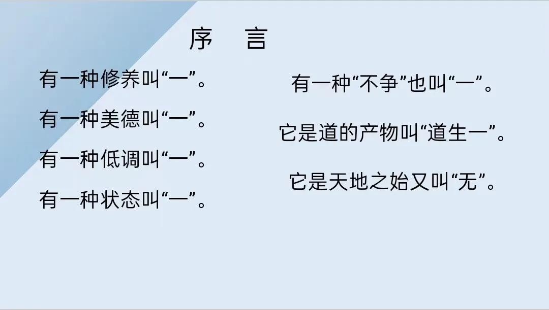 《道德经》中说“道生一”,“一”就是“德”,“一”就是“无”,“一”就是“谷”,“一”就是“朴”,就是“弱”,就是“雌”,就是“婴儿”。“一”是对“道”的最直接的运用。