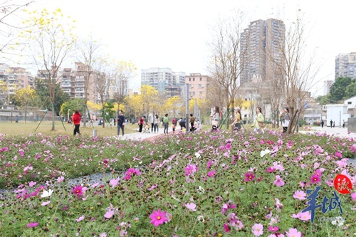 不少市民游客到此赏花,孩童在花间雀跃玩耍