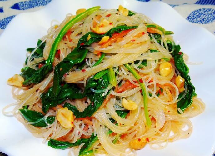 食材:菠菜、粉丝、胡萝卜、熟花生、盐、生抽、蒜、辣椒粉、十三香、香油、醋